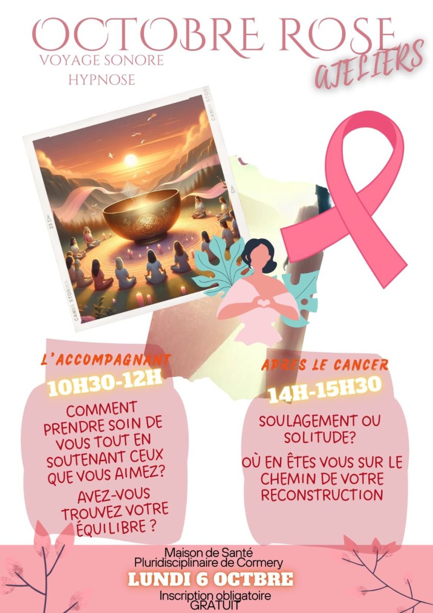 La maison de santé pluridisciplinaire de Cormery participe au mois de sensibilisation au dépistage du Cancer du Sein. Venez vivre un moment unique de détente et de reconnexion lors de notre atelier collectif le mercredi 16 octobre de 10h à 13h.